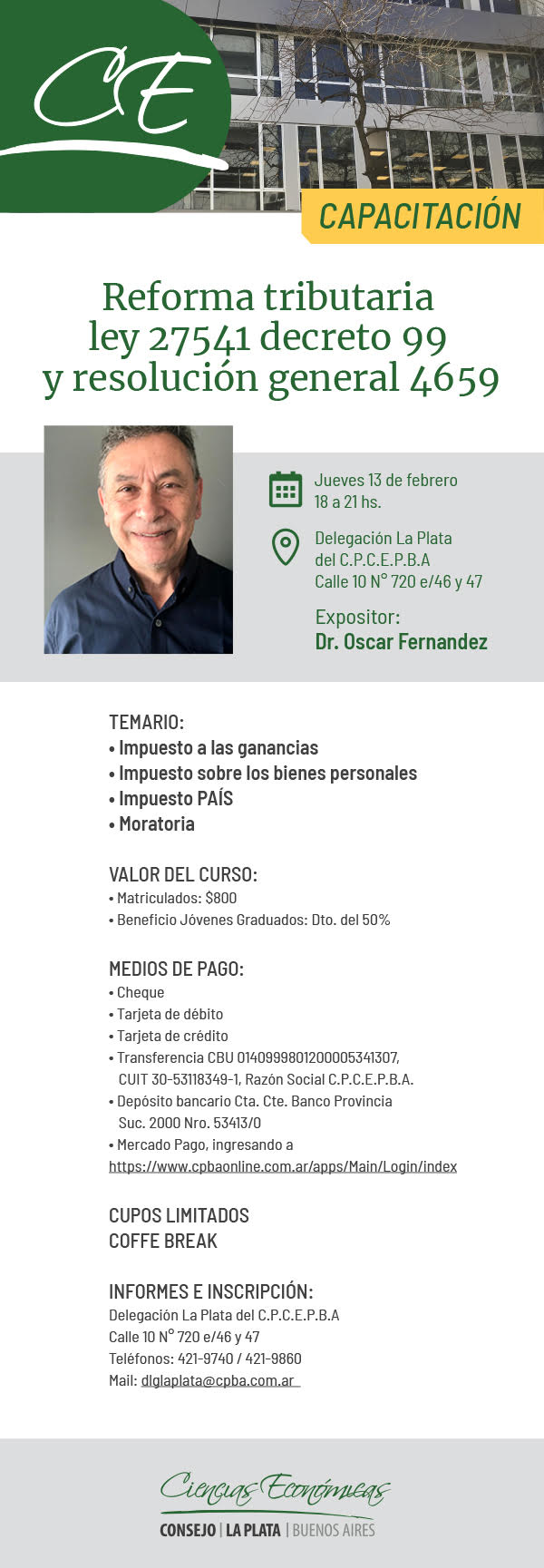 El jueves 13 de febrero, de 18 a 21, se dictará en la sede de la Delegación un curso titulado “Reforma Tributaria. Ley 27541 decreto 99 y resolución general 4659”.