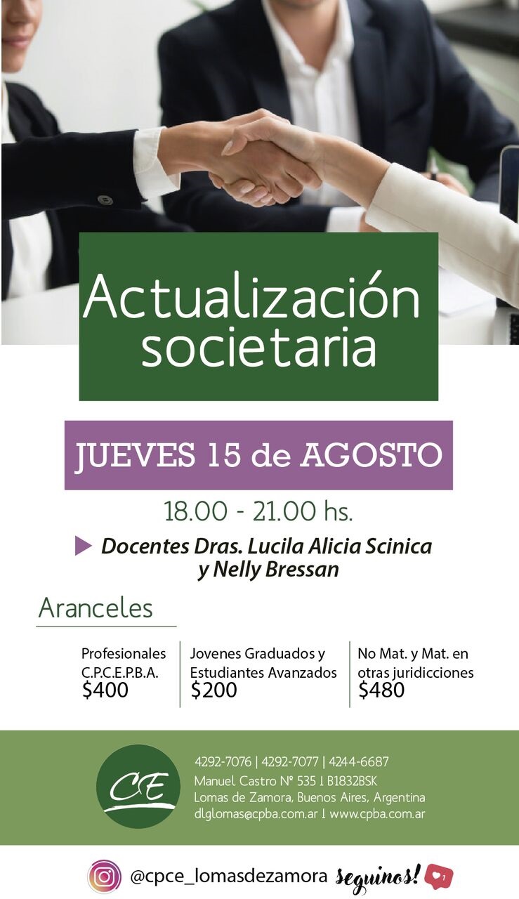 Las Dras. Lucila Alicia Scinica y Nelly Bressan dictarán el jueves 15 de agosto de 18 a 21 una capacitación en la Delegación sobre novedades societarias.