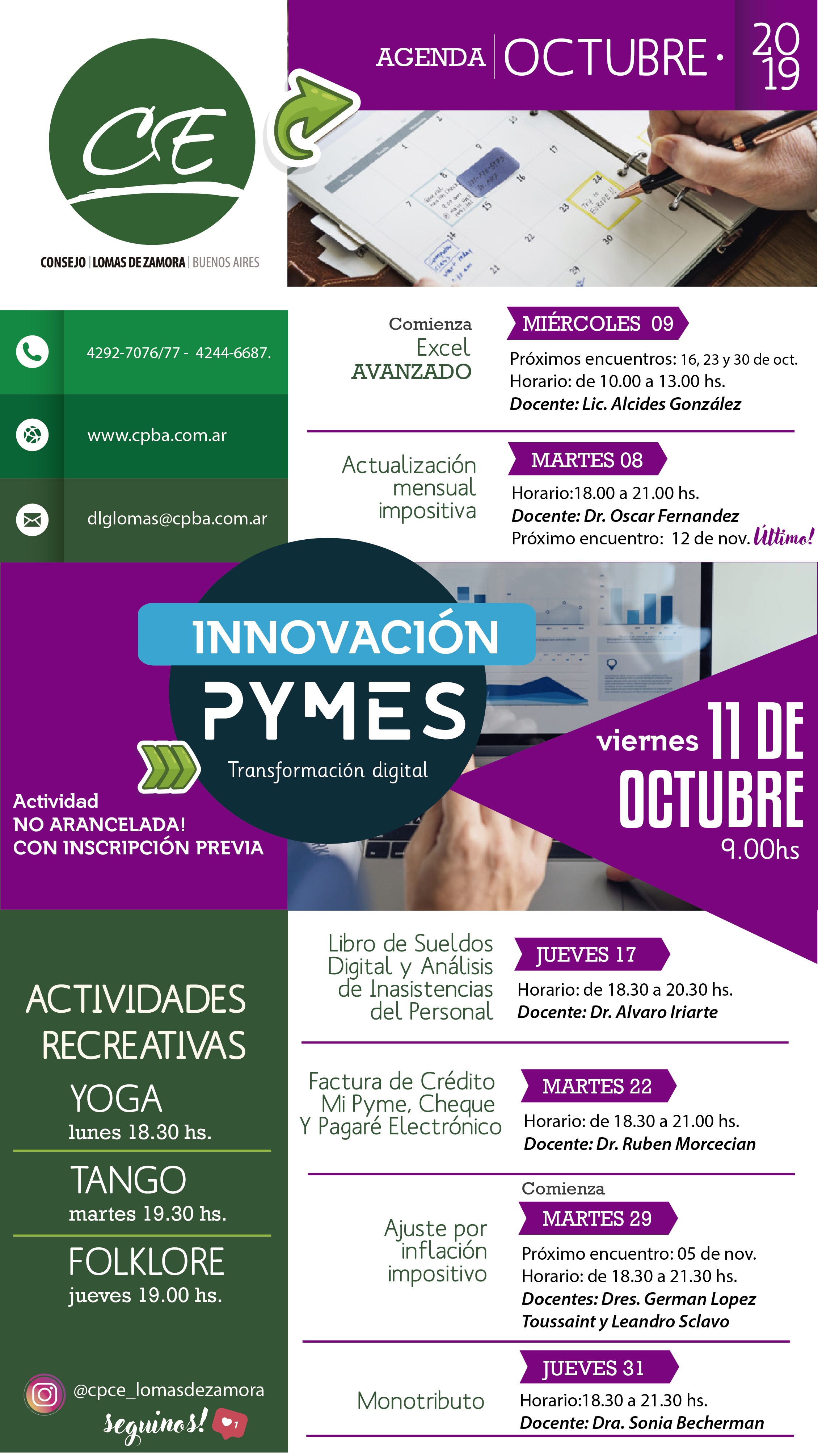La oferta comienza el miércoles 9 de octubre con un curso sobre Excel avanzado, continúa con una Jornada de innovación PyME el viernes 11 de octubre y finaliza el jueves 31 de octubre con una capacitación sobre monotributo, entre otras actividades.