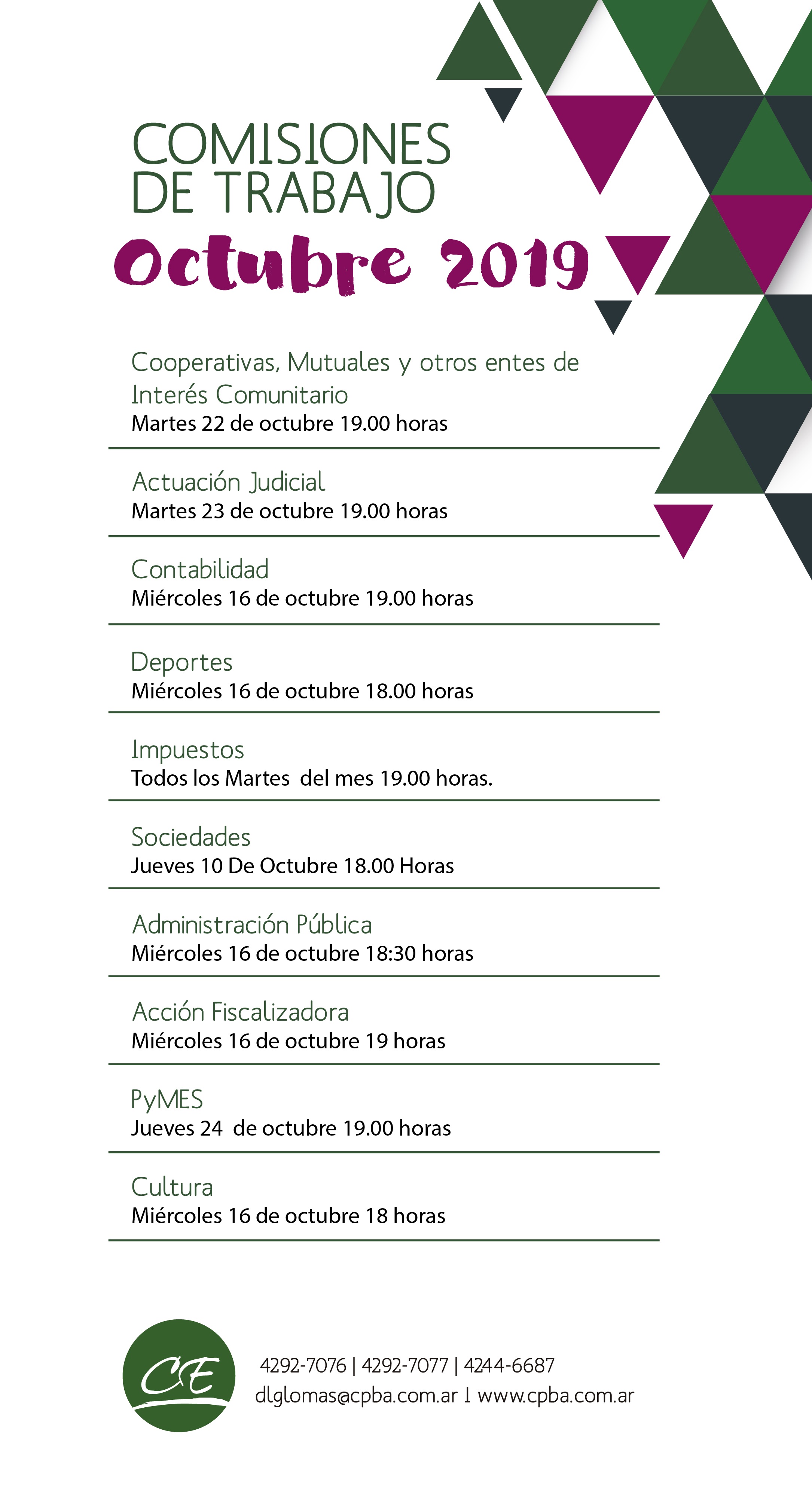 Para mayor información y horarios ver archivo en Link de interés o puede comunicarse a los teléfonos (011) 4292 7076, 4292 7077 y 4244 6687 y a través de correo electrónico a dlglomas@cpba.com.ar.