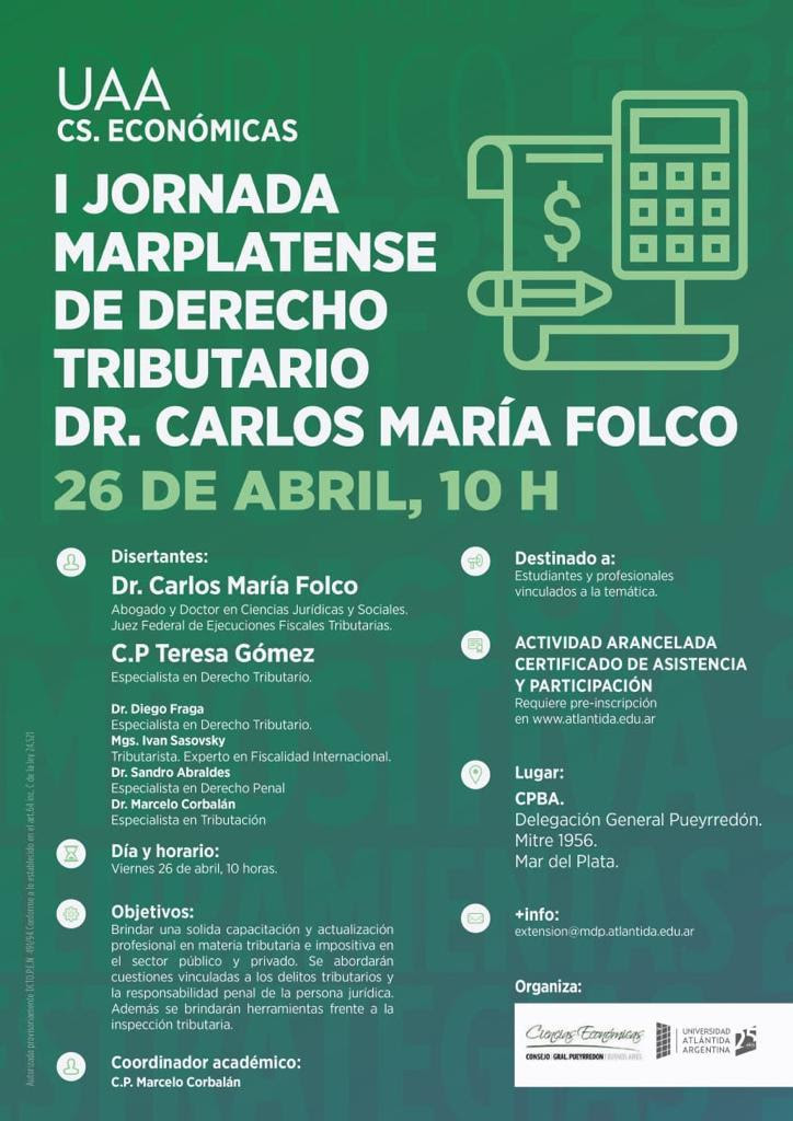 Se encuentra abierta la inscripción para participar de la 1º Jornada Marplatense de Derecho Tributario "Dr. Carlos María Folco" organizada por la Secretaría de Extensión y la Facultad de Ciencias Económicas de la Universidad Atlántida en conjunto con la Delegación.