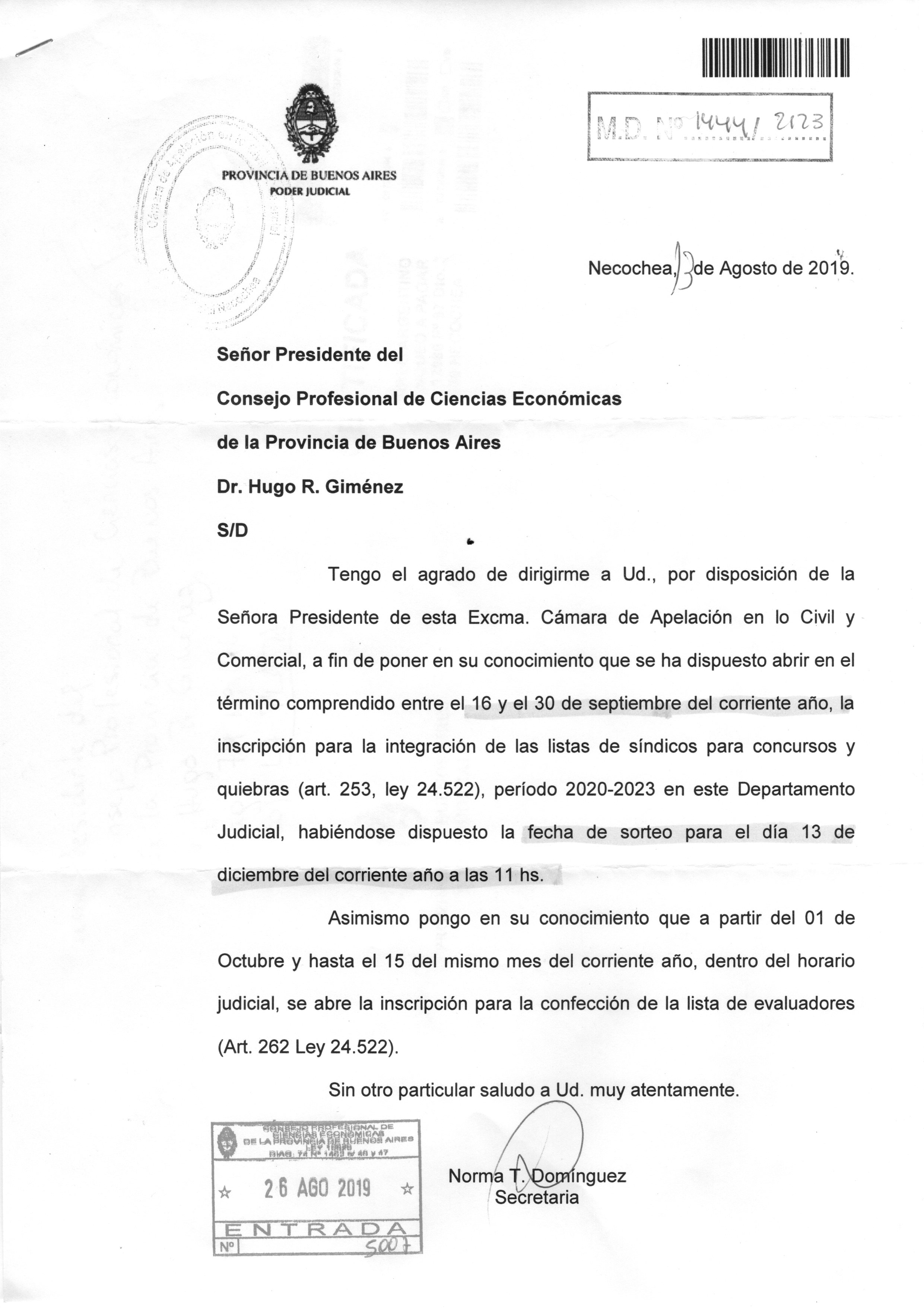 En cuanto a la Cámara de Apelanción en lo Civil y Comercial del Depto. Judicial de Necochea, la inscripción tendrpa lugar desde el 16 hasta el 30 de septiembre. El sorteo público se realizará el 13 de diciembre.