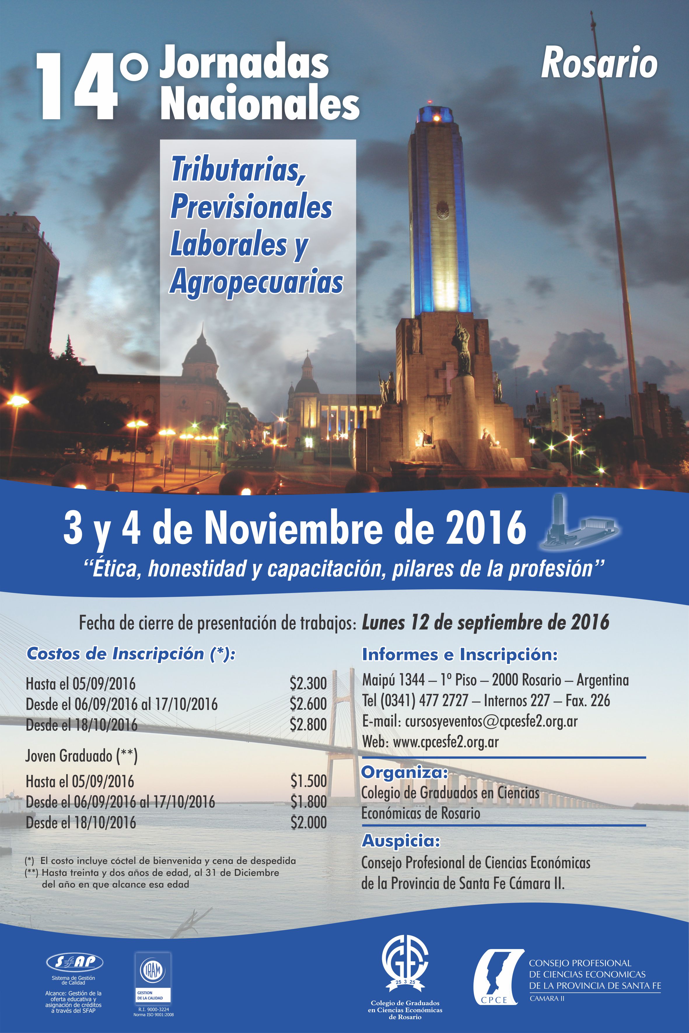 Bajo el lema “Ética, honestidad y capacitación, pilares de la profesión”, la ciudad de Rosario será sede de un nuevo encuentro de profesionales. Se trata de las Jornadas Nacionales Tributarias, Previsionales Laborales y Agropecuarias, organizadas en su edición 14ta. por el Colegio de Graduados en Ciencias Económicas de Rosario.