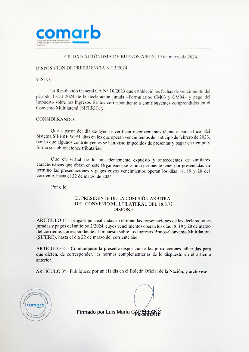 La solicitud consiguió que la Comisión Arbitral del Convenio Multilateral (ComArb) prorrogara las fechas de vencimiento para el pago del Impuesto a los Ingresos Brutos - Convenio Multilateral (SIFERE), al día 22 de marzo.