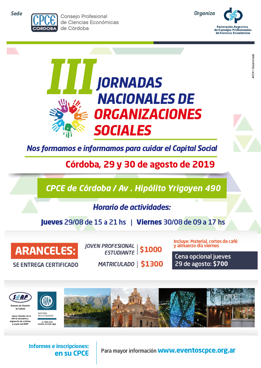 La Federación Argentina de Consejos Profesionales de Ciencias Económicas (FACPCE), en conjunto con el Consejo Profesional de Ciencias Económicas de Córdoba, invita a participar de las III Jornadas Nacionales de Organizaciones Sociales que se llevarán a cabo en la ciudad de Córdoba los días 29 y 30 de agosto.